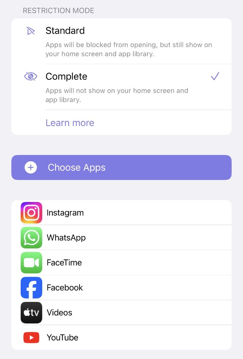 • If the Complete is selected, when the Apps are restricted, they will not show on your home screen and app library.