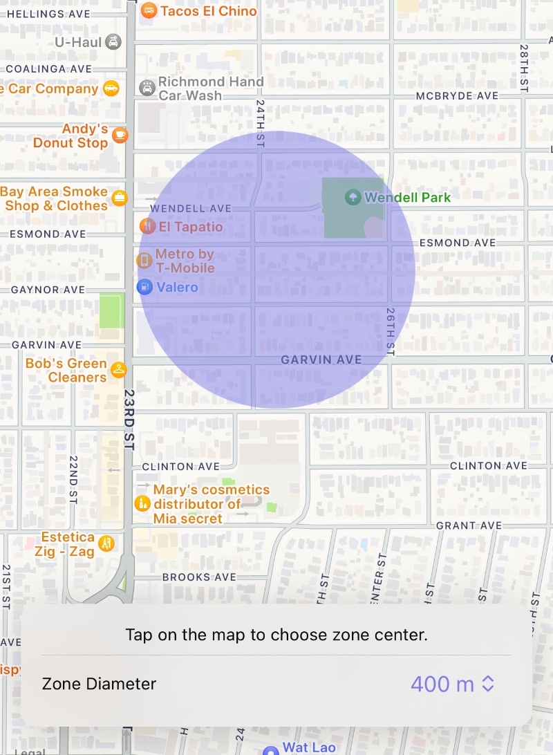 Then tap on a spot on the map to set the center of the safe area and select an appropriate diameter.