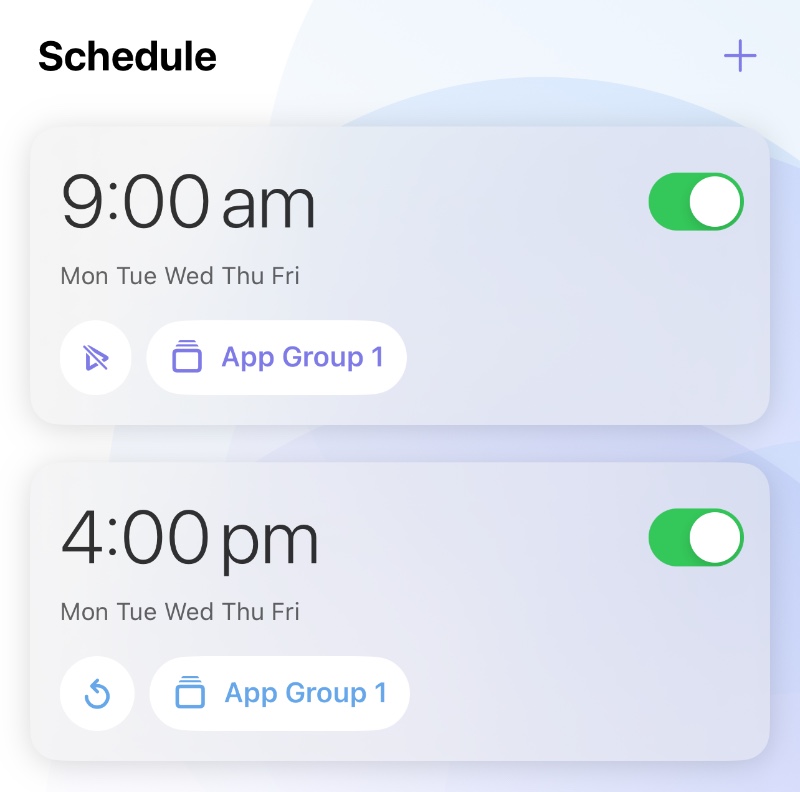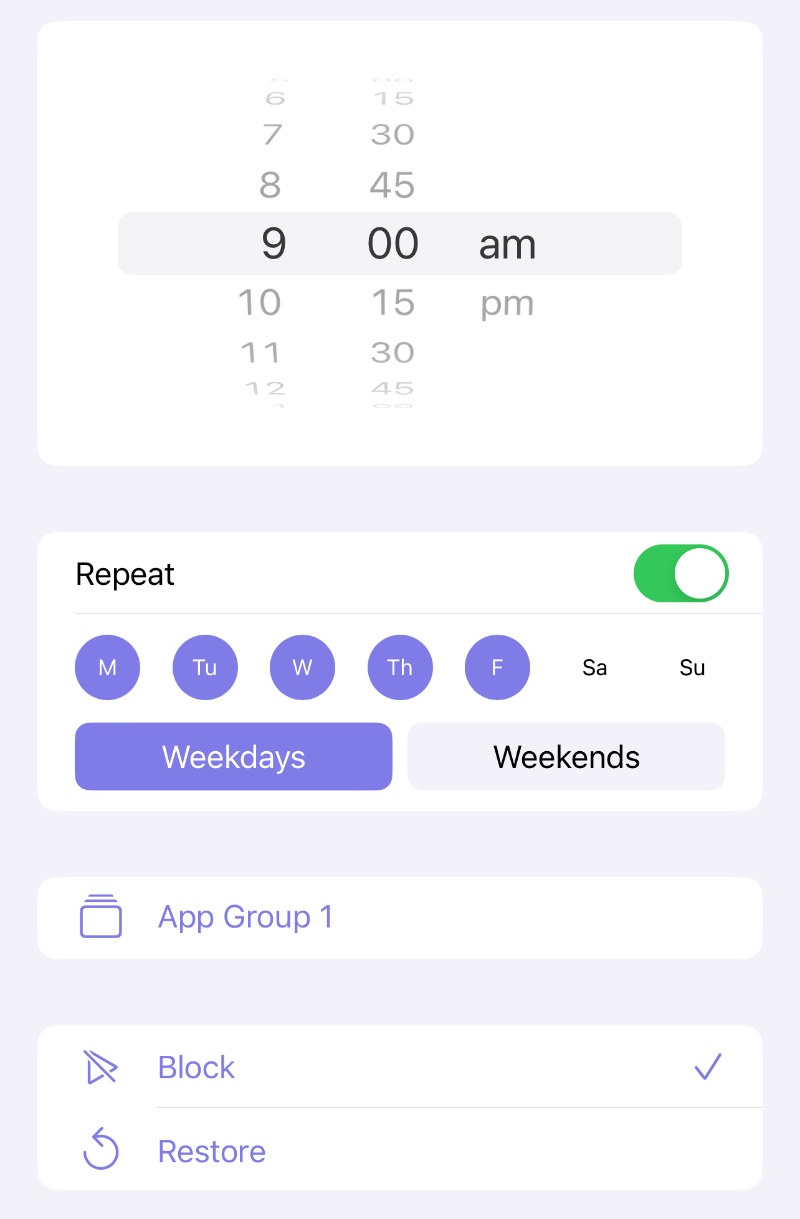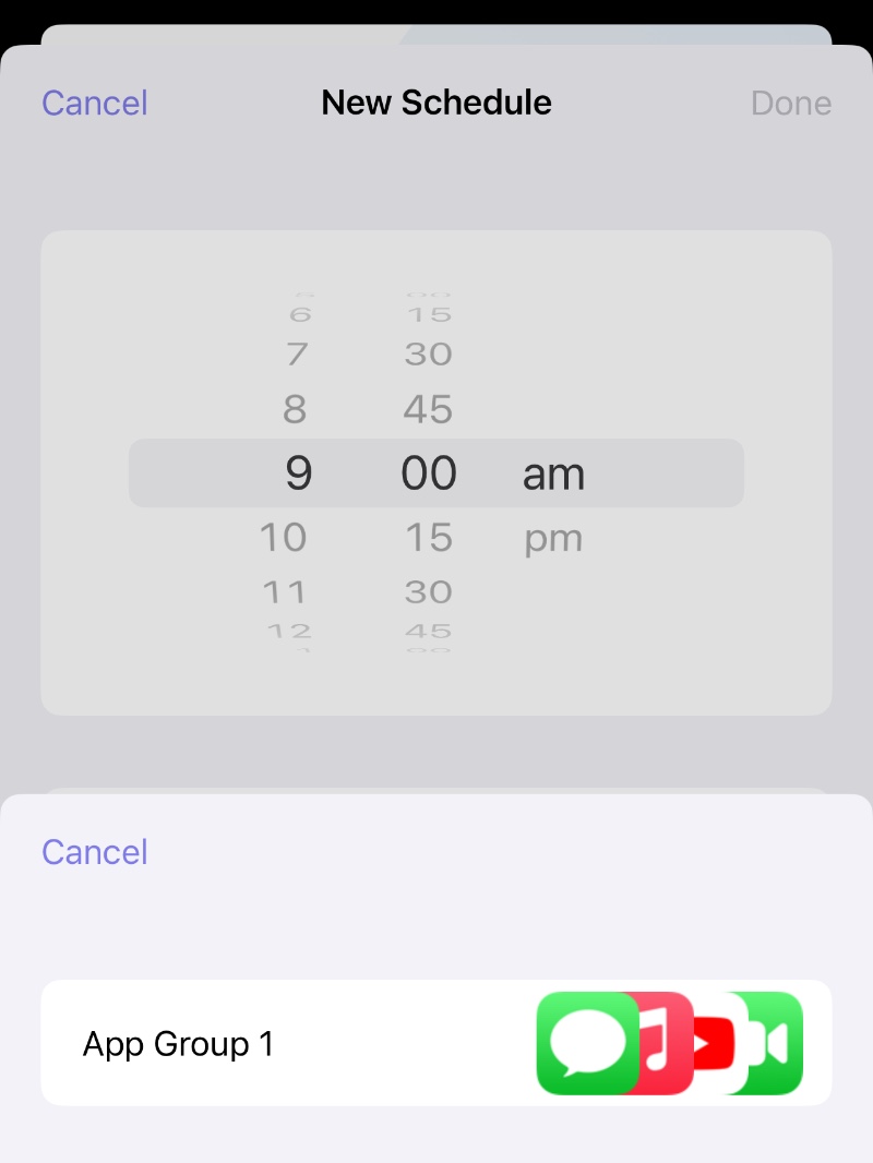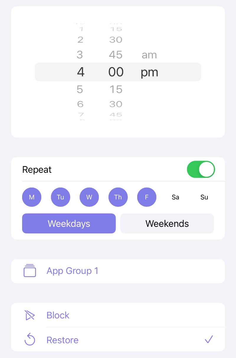 Tap "Done" to finish, then tap "+" to create a another schedule rule for restoring the app group after school, for example, set the time to 4 pm, select Weekdays, and select Restore as mode.