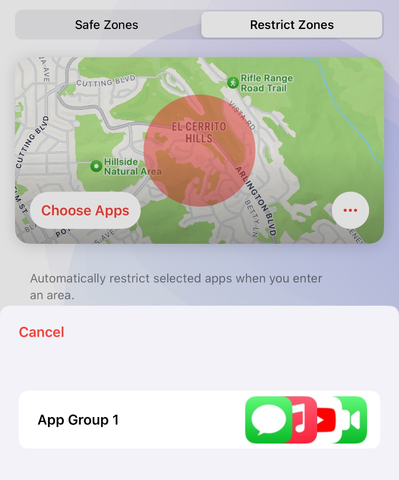 When finished by taping "Done", tap "Choose Apps" to select a created group to apply the Restrict Zone.