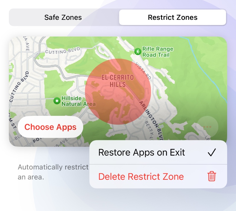 Selected group are now automatically restricted when your child enter the school area. If you also want to automatically restore the use of apps when your child leave the area, please tap "..." on the card and select "Restore Apps on Exit".